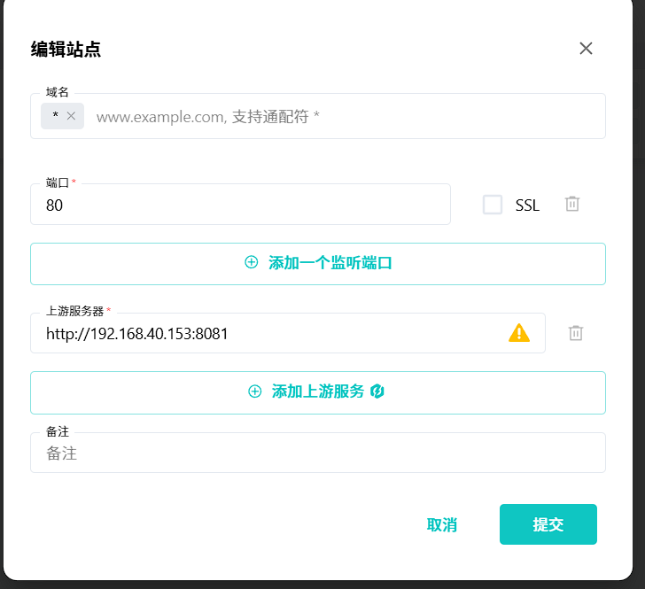 域名: 通过雷池访问该应用时使用的域名 (支持使用 * 做为通配符),注意修改 DNS 解析到雷池 IP