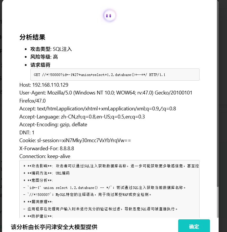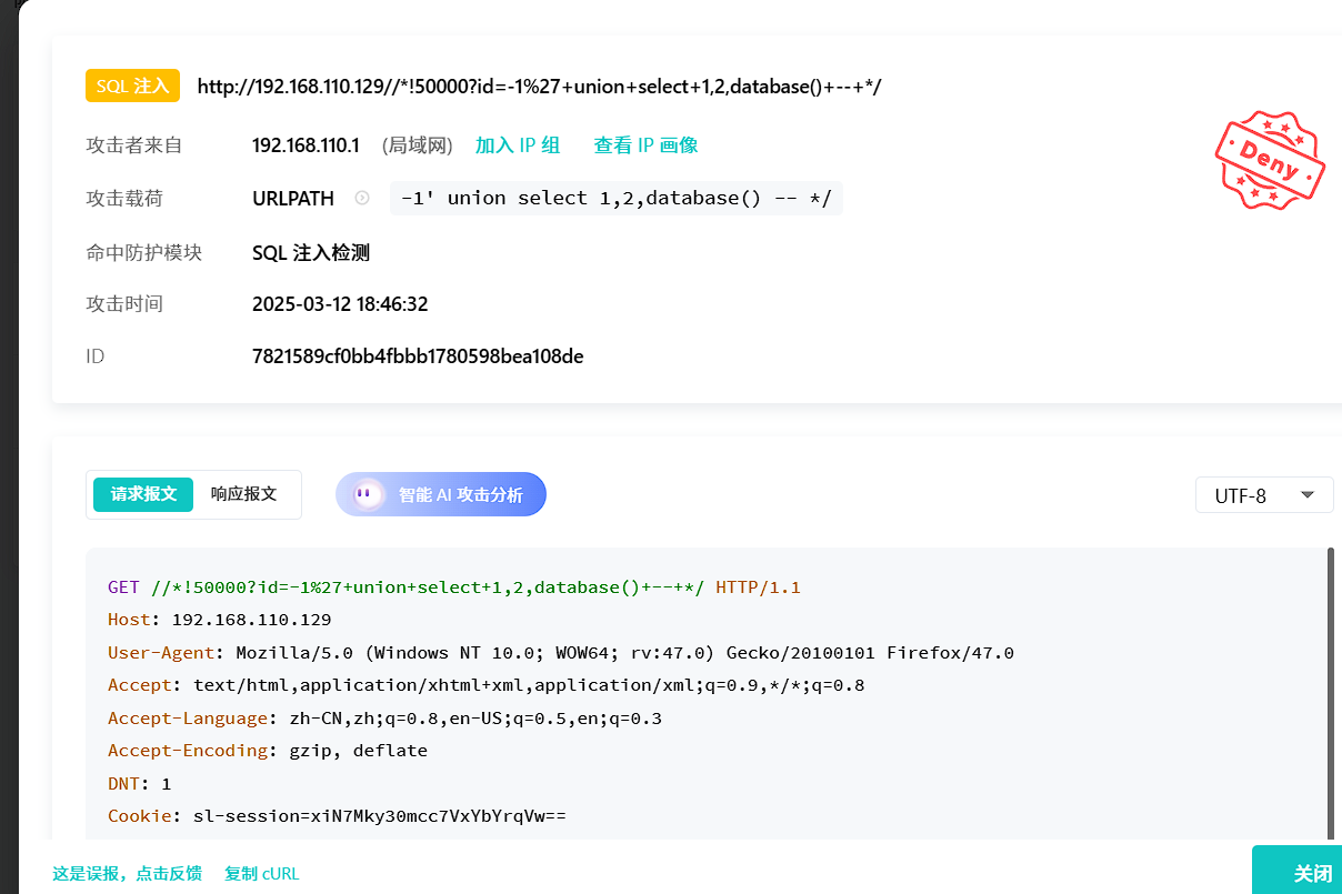 配置完成之后可以通过模拟 SQL 注入攻击: https://chaitin.com/?id=1+and+1=2+union+select+1