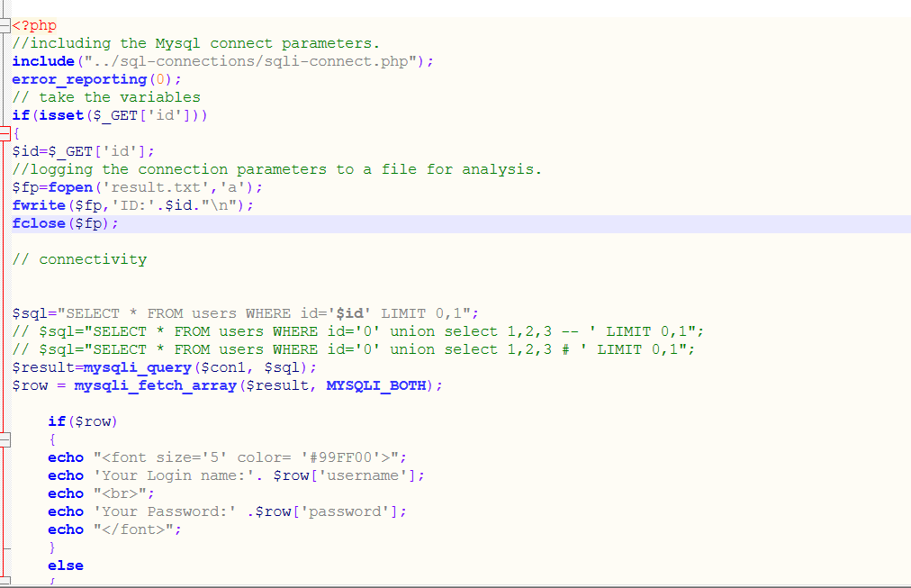 $sql="SELECT * FROM users WHERE id='$id' LIMIT 0,1;";这个查询数据的SQL语句,id参数通过GET传参到这里进行查询。如果我们传的id=1,那语句就变成了:
