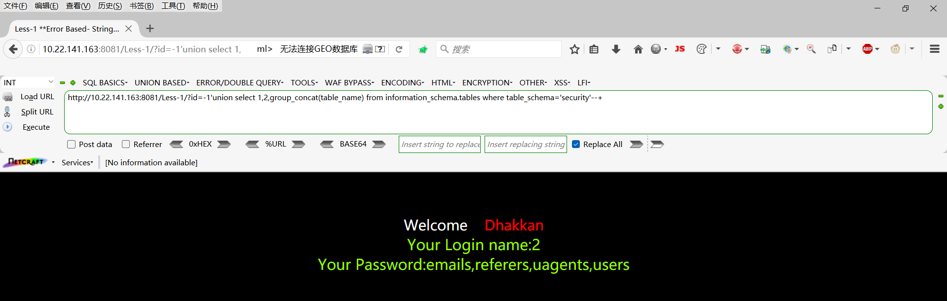 ?id=-1' union select 1,2,group_concat(table_name) from information_schema.tables where table_schema='security'--+(group_concat是连接函数,把字段合在一起,information_schema.tables 表示的是该数据库下的表,where是判断条件,只有mysql数据库才是information_schema.tables,其他数据库语句不同,这sql语句的意思就是查询information_schema数据库下的tables表里面且table_schema字段内容是security的所有table_name的内容。)